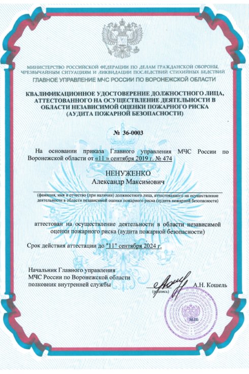 Два эксперта нашей компании — Ненуженко А.М. и Сараева Н.В. — успешно сдали квалификационный экзамен и на основании приказа Главного управления МЧС России по Воронежской области от 11 сентября 2019 года были аттестованы на осуществление деятельности в области независимой оценки пожарного риска.